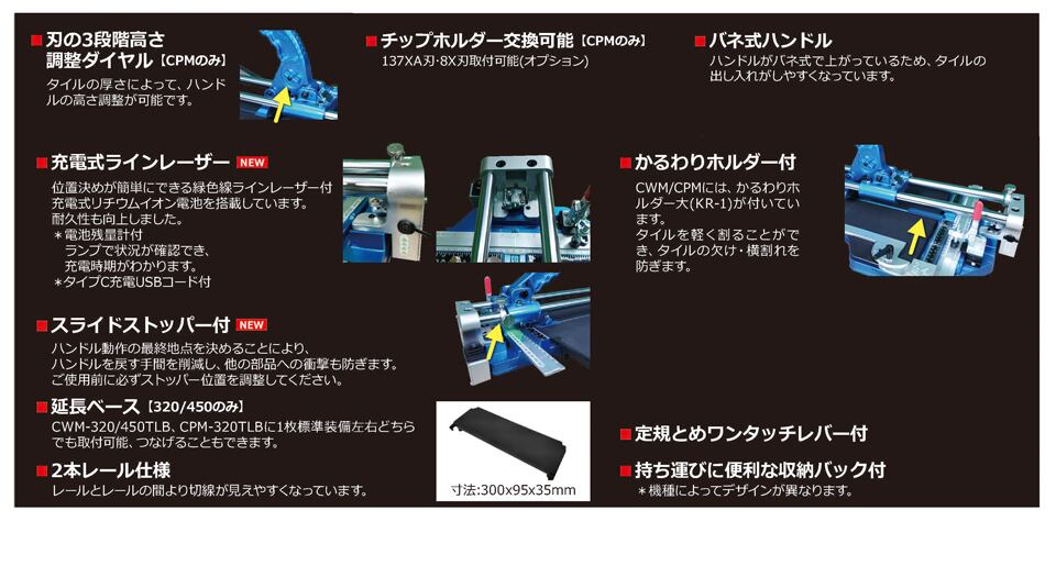 ●切刃高3段階調整機能付が様々なタイルの厚みに対応 。