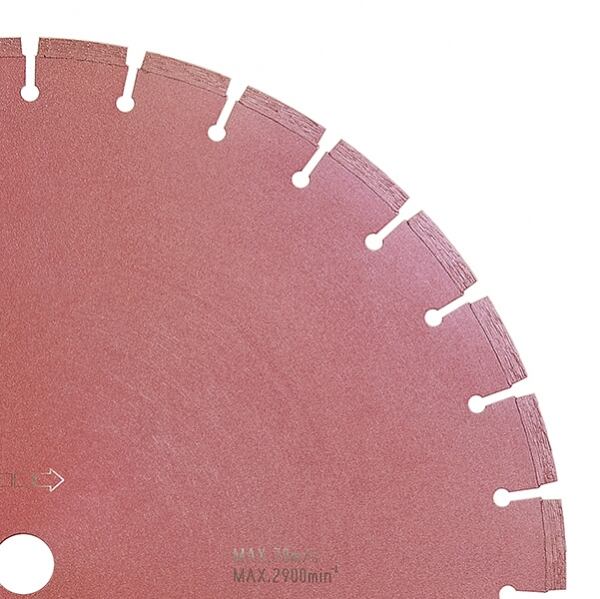 セグメントタイプで切れ込みから、切り粉を効率的に逃がし、ダイヤの冷却効果も非常に高く、切削性に優れています。一般舗装工事用。