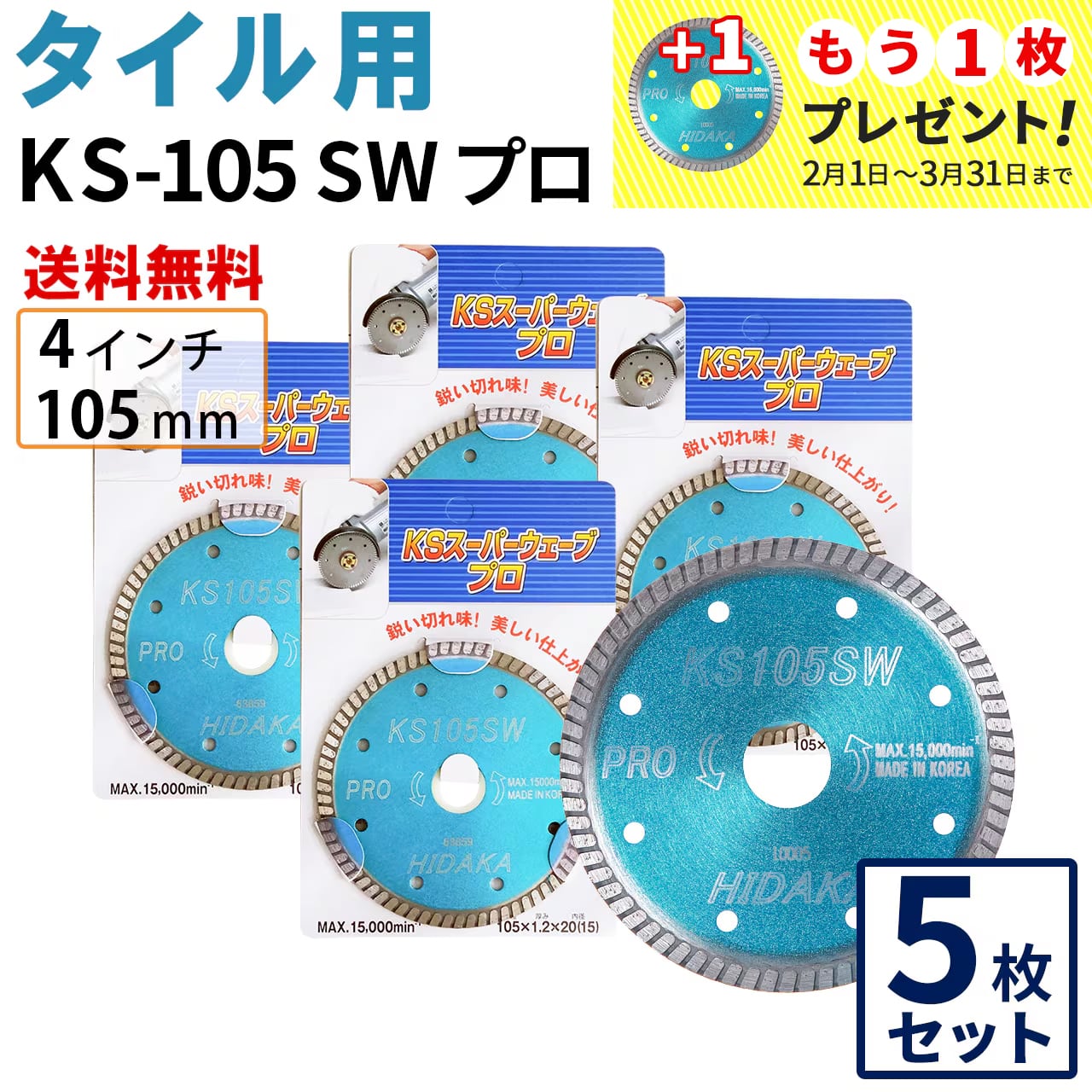 【5枚セット】【送料無料】KSスーパーウェーブ KS-105SW プロ 4インチ 105mm ダイヤモンドカッター 刃 タイル切断 ks-105sw-05