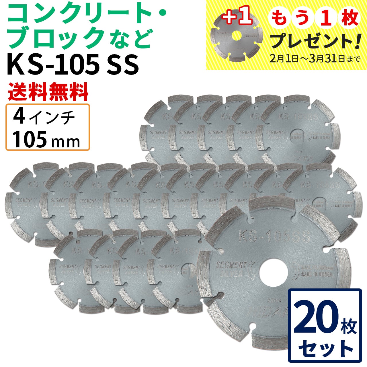 【20枚セット】【送料無料】KS-105SS KSセグメントシルバー 4インチ 105mm コンクリート・ブロックなどの切断用 ダイヤモンドカッター 刃(ks-105ss-20)